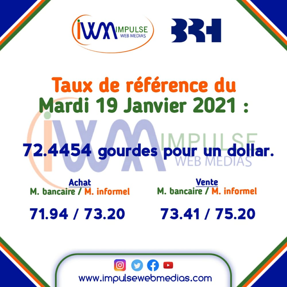 Le taux de référence pour ce mardi 19 janvier 2021 est 72, 44 gourdes pour un dollar américain.