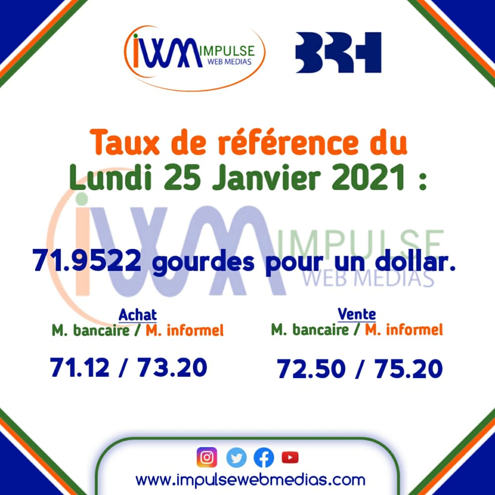 Impulse Web Medias vous présente chaque matin, le taux de référence de la Banque de la République d’Haiti (BRH), les taux à l’achat et à la vente dans les banques commerciales et sur le marché informel via un format simple et précis pour une meilleure compréhension.