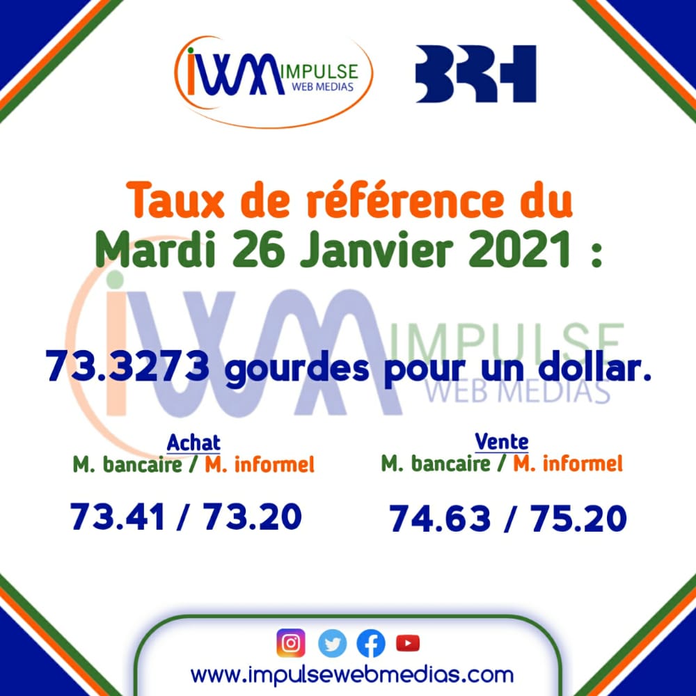 Le taux de référence pour ce mardi 26 janvier 2021 est 73,32 gourdes pour un dollar américain.