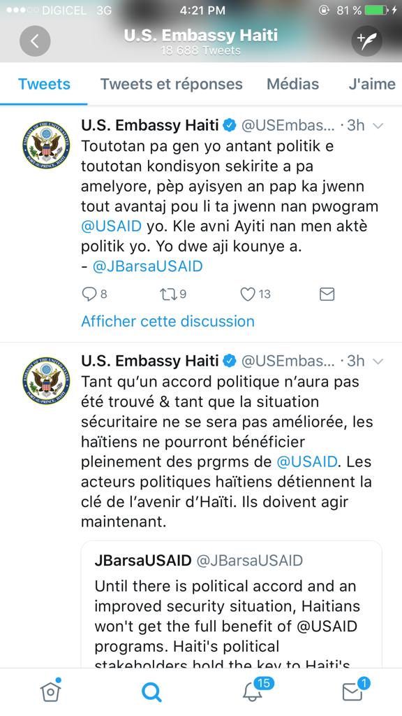 L’Ambassade américaine en Haïti informe sur son compte Twitter ce mercredi, « tant qu’un accord politique n’aura pas été trouvé et tant que la situation sécuritaire ne sera pas améliorée, les haïtiens ne pourront bénéficier pleinement des programmes de l’USAID ».