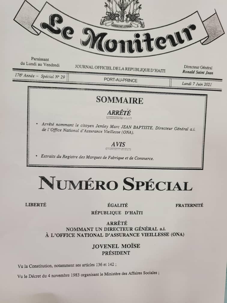 Rappelons que l’ancien directeur de l’ONA avait été décédé dans un centre hospitalier qui accueille les patients infectés au Coronavirus. Ses funérailles sont prévues pour le samedi 12 juin prochain à l’Église Saint-Pierre de Pétion-Ville. Par arrêté présidentiel, publié ce mercredi 9 juin 2021, Jemley Marc Jean Baptiste a été nommé Directeur Général a.i. de l’Office National d’Assurance-Vieillesse (ONA).