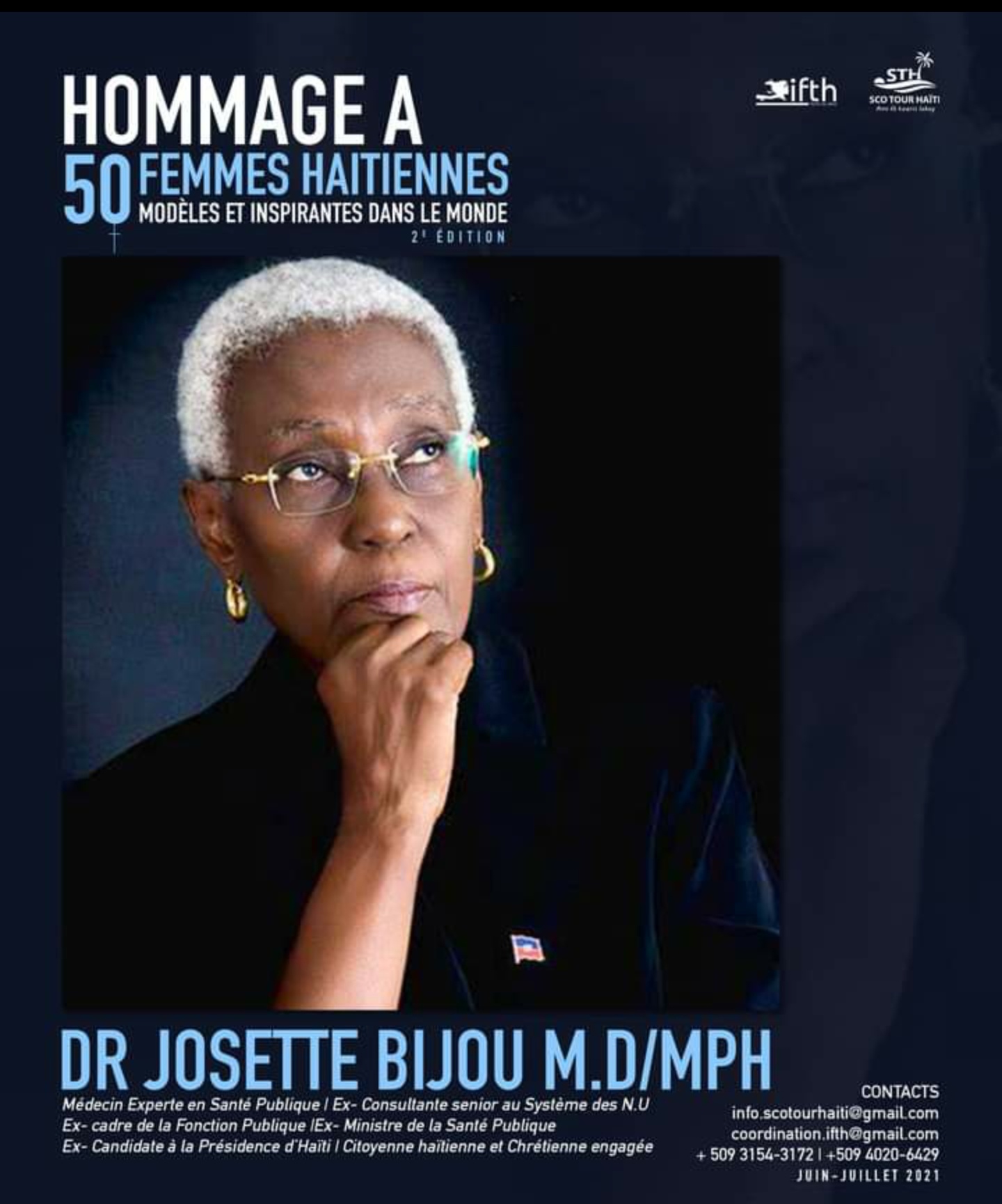 Dans le cadre de la 2e édition du projet hommage aux 50 femmes haïtiennes modèles et inspirantes, l’Initiative des femmes haïtiennes dans le tourisme (IFTH) et Sco Tour Haïti (STH), vous invitent au cours des mois de juin et juillet 2021, à découvrir virtuellement une cinquantaine de femmes haïtiennes évoluant en Haïti et à travers les quatre coins du monde parmi lesquelles Dr Josette BIJOU,