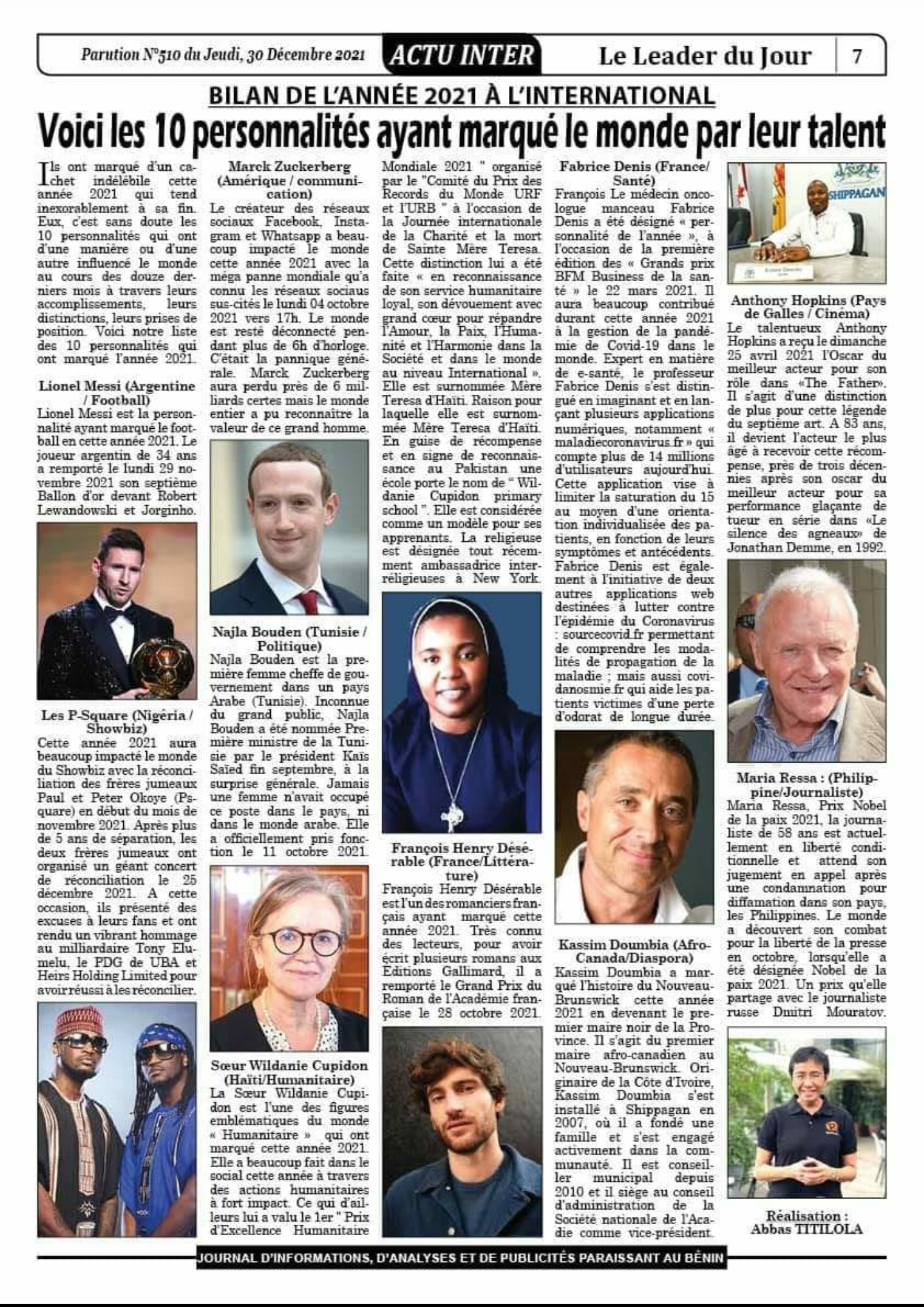 Dans le journal international ‘’Actu Inter”, sœur CUPIDON est l’une des figures emblématiques du monde humanitaire pendant l’année 2021. En conséquence, elle est nominée parmi les 10 personnalités ayant marqué le monde au cours de cette année. Avec sa fondation, sœur CUPIDON est impliquée beaucoup dans le social et dans des actions humanitaires à travers le monde.