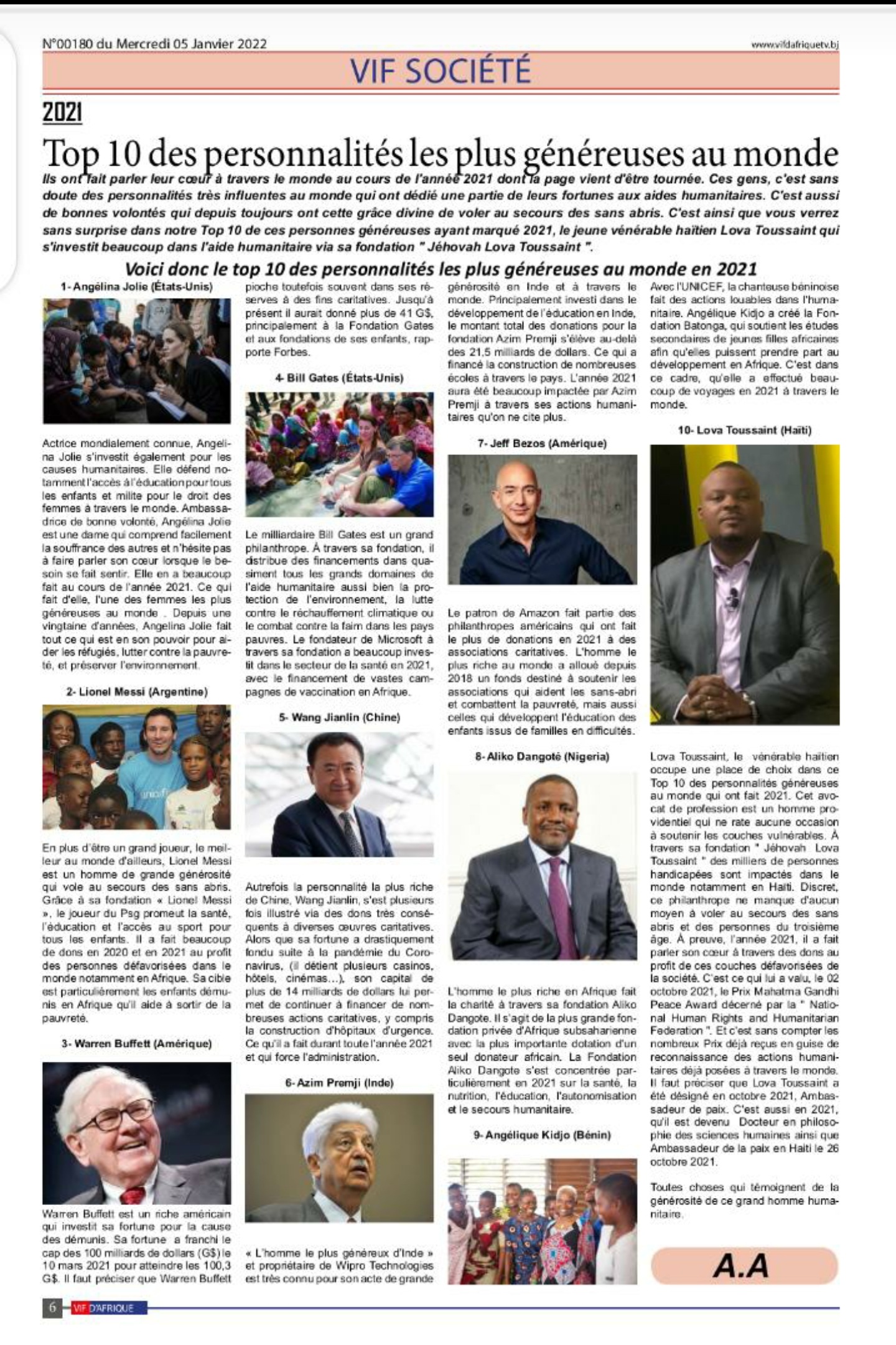 Selon ‘’décryptage infos”, un journal international, voici le top 10 des personnalités les plus généreuses durant l’année 2021.