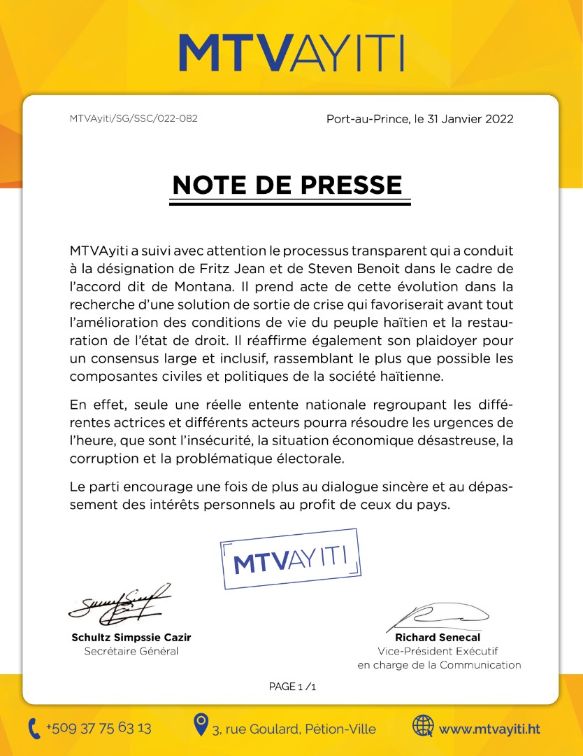 Le Mouvement pour la Transformation et la Valorisation d’Haïti (MTVAyiti) informe avoir suivi avec attention le processus électoral ayant conduit à la désignation de Fritz Jean et Steven Benoît dans le cadre de l’accord de Montana. “C’est un premier pas vers une solution de sortie de crise qui consiste à améliorer les conditions de vie de la population et la restauration de l’ État de droit” peut- on lire dans une note de presse parue hier lundi 31 janvier.