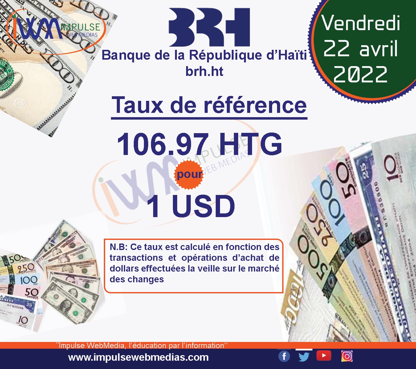 Impulse Web Medias vous présente chaque matin, le taux de référence de la Banque de la République d’Haïti (BRH)