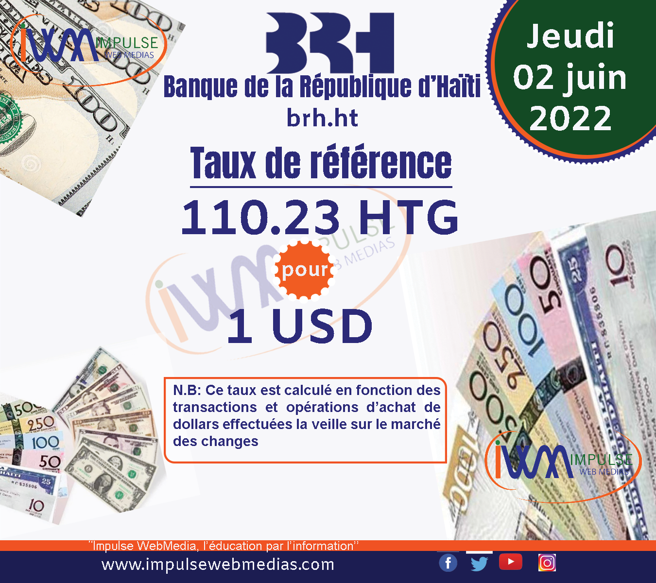 Impulse Web Medias vous présente chaque matin, le taux de référence de la Banque de la République d’Haïti (BRH).