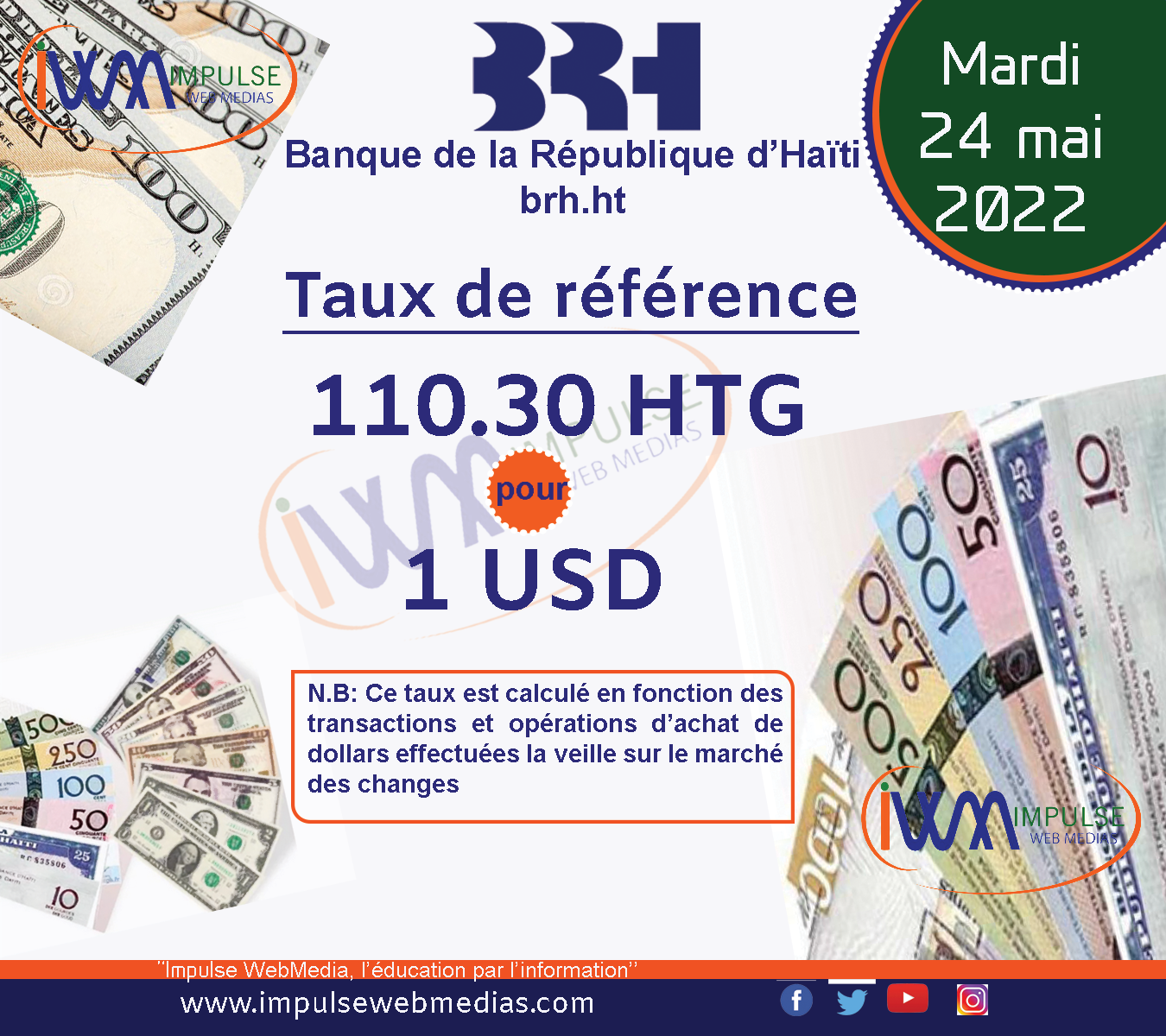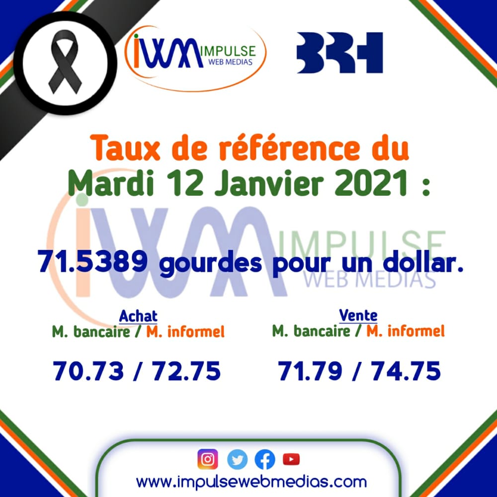 Impulse Web Medias vous présente chaque matin, le taux de référence de la Banque de la République d’Haïti (BRH).