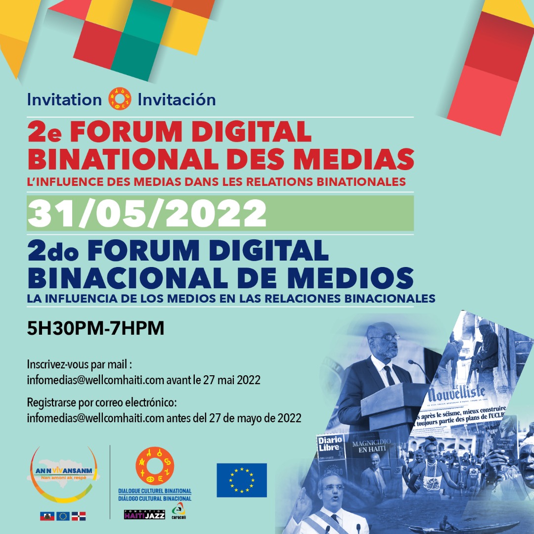Plus d’une vingtaine de journalistes haïtiens et dominicains se sont entretenus, une nouvelle fois, sur de nouvelles perspectives de collaboration pour traiter des informations concernant l’île entière. Cet échange a eu lieu hier mardi 31 mai 2022 dans le cadre de la tenue du 2e forum virtuel binational des médias financé par l’Union Européenne et mis en œuvre par la Fondation Haïti Jazz et Caracoli autour du thème « L’influence des médias dans les relations binationales ».