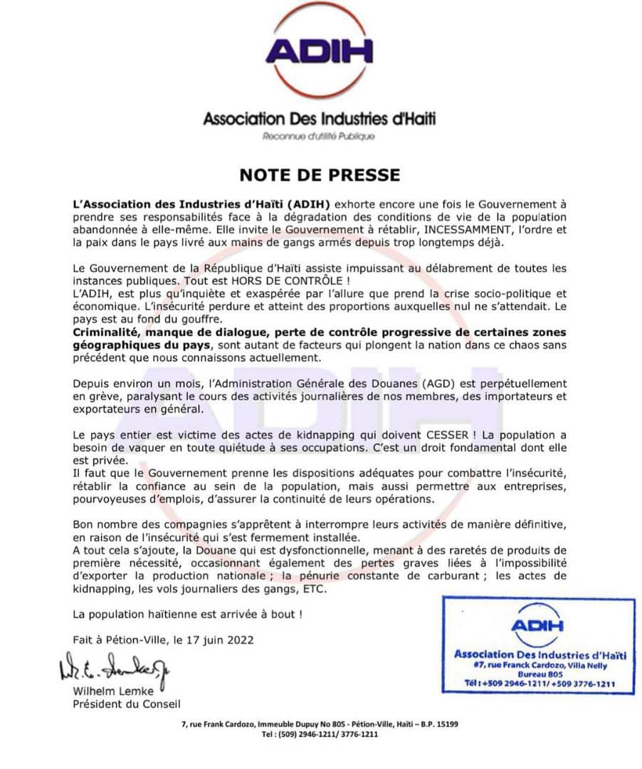 Dans une note publiée le vendredi 17 juin 2022, l’Association des Industries d’Haïti exprime ses préoccupations face à la dégénérescence de la situation sécuritaire du pays.