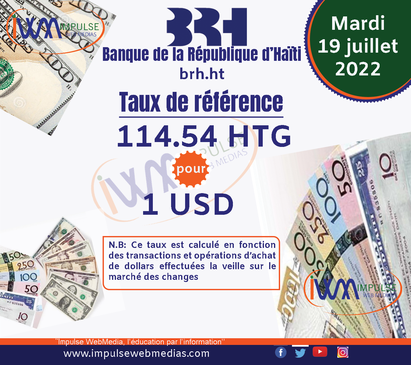 Impulse Web Medias vous présente chaque matin, le taux de référence de la Banque de la République d’Haïti (BRH).