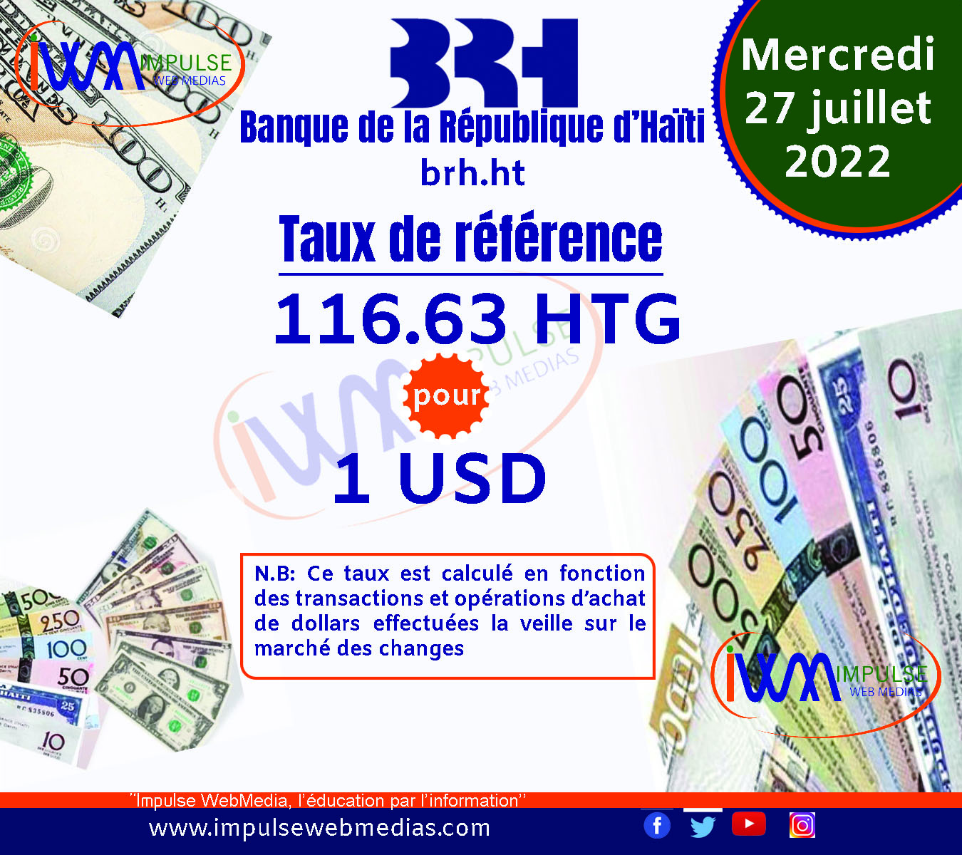 Impulse Web Medias vous présente chaque matin, le taux de référence de la Banque de la République d’Haïti (BRH).
