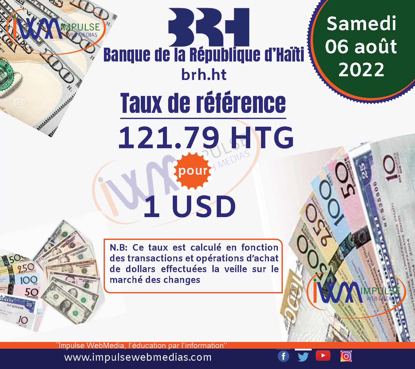 Impulse Web Medias vous présente chaque matin, le taux de référence de la Banque de la République d’Haïti (BRH).