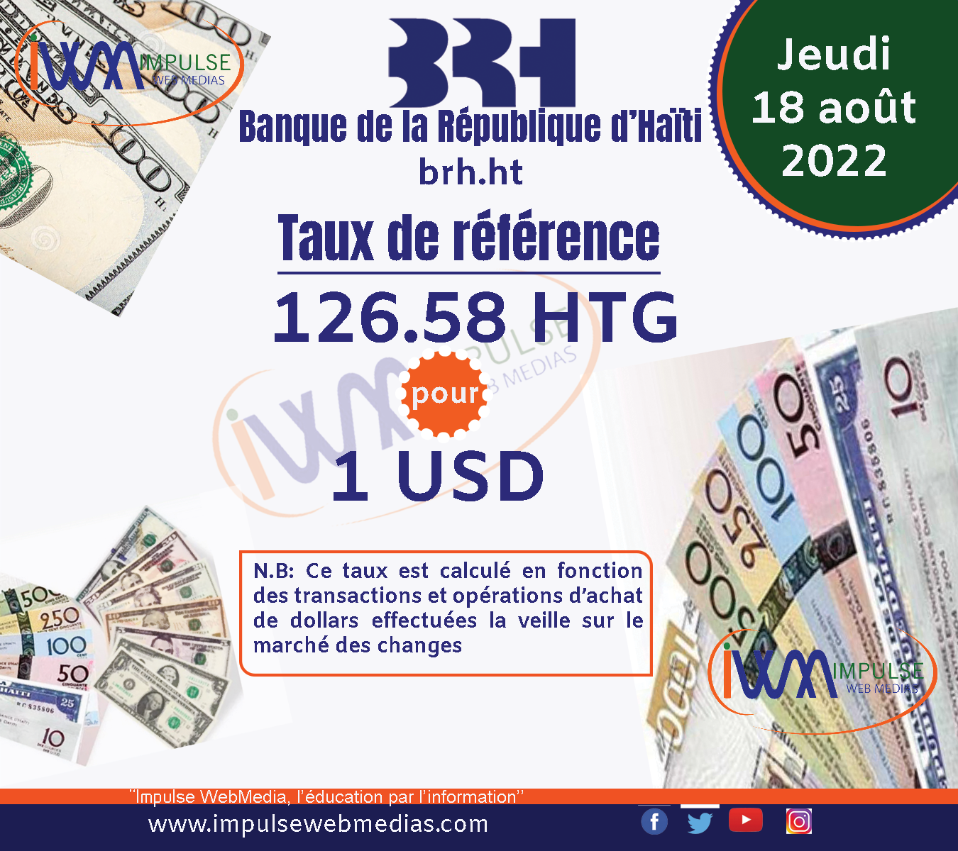 Impulse Web Medias vous présente chaque matin, le taux de référence de la Banque de la République d’Haïti (BRH).