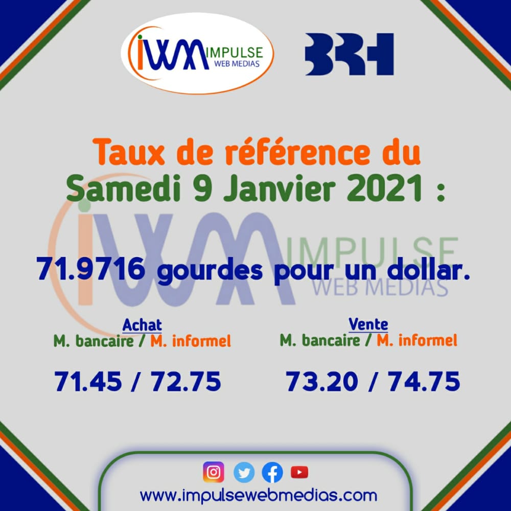Impulse Web Medias vous présente chaque matin, le taux de référence de la Banque de la République d’Haïti (BRH).