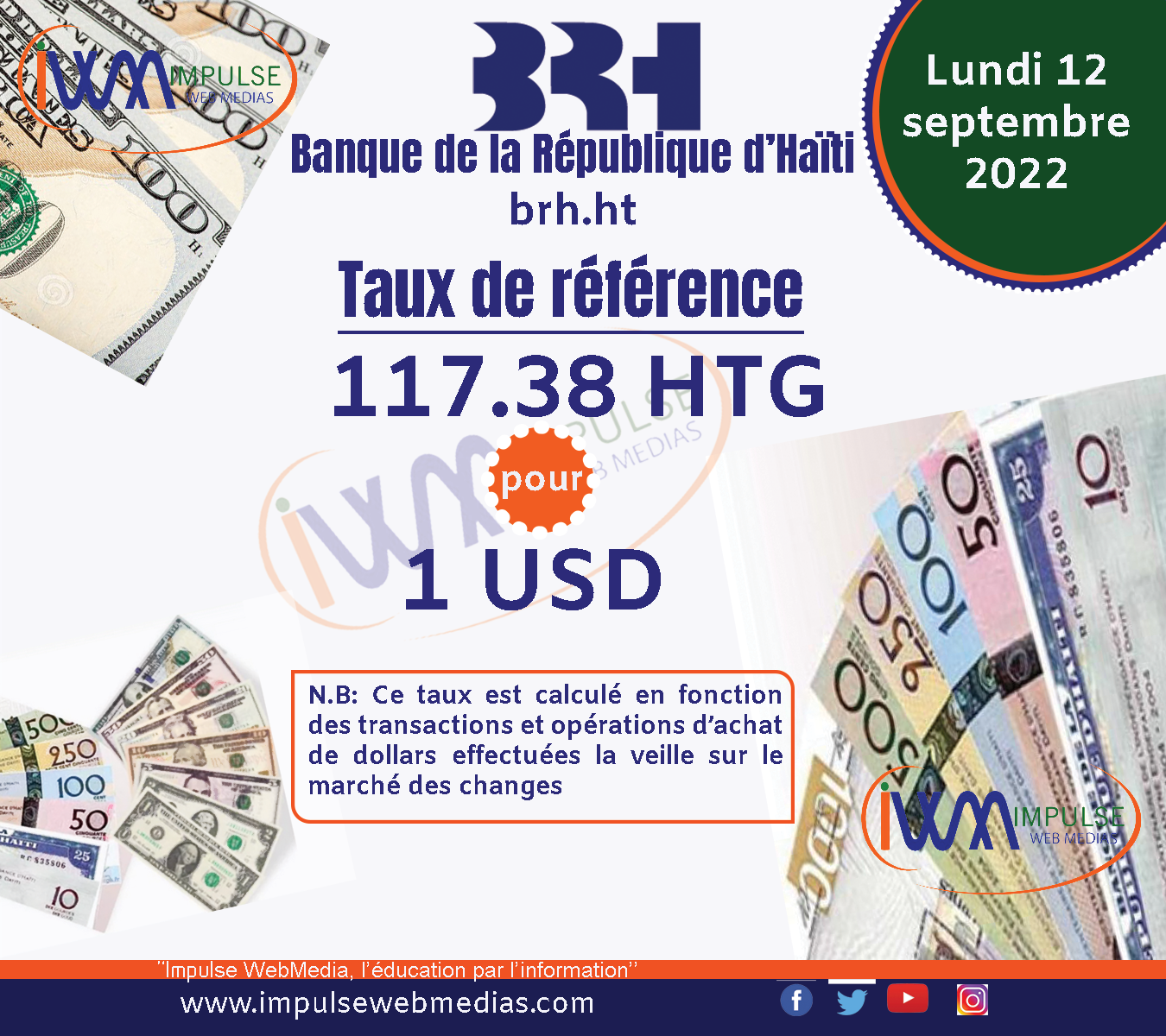 Impulse Web Medias vous présente chaque matin, le taux de référence de la Banque de la République d’Haïti (BRH).