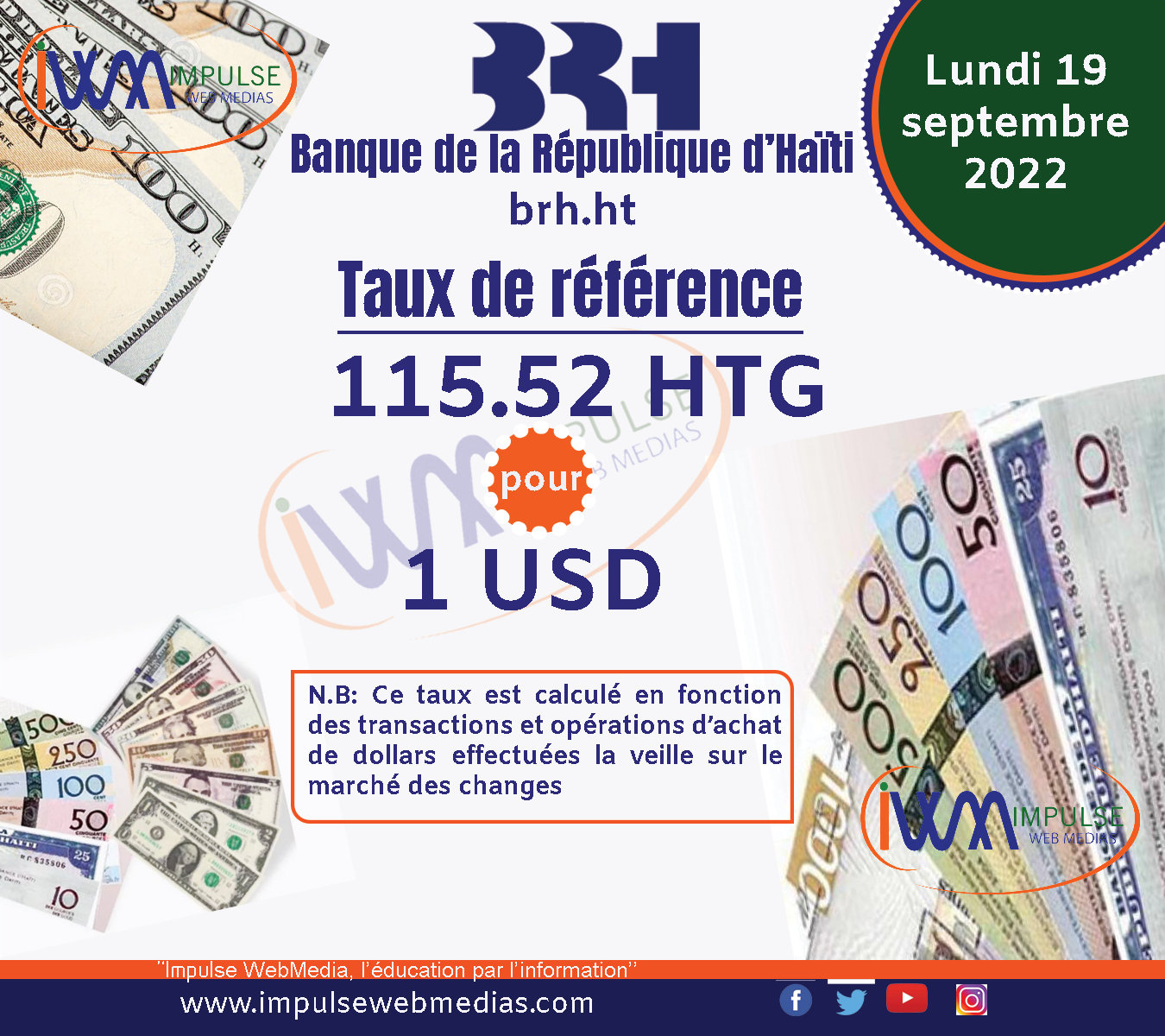 Impulse Web Medias vous présente chaque matin, le taux de référence de la Banque de la République d’Haïti (BRH).