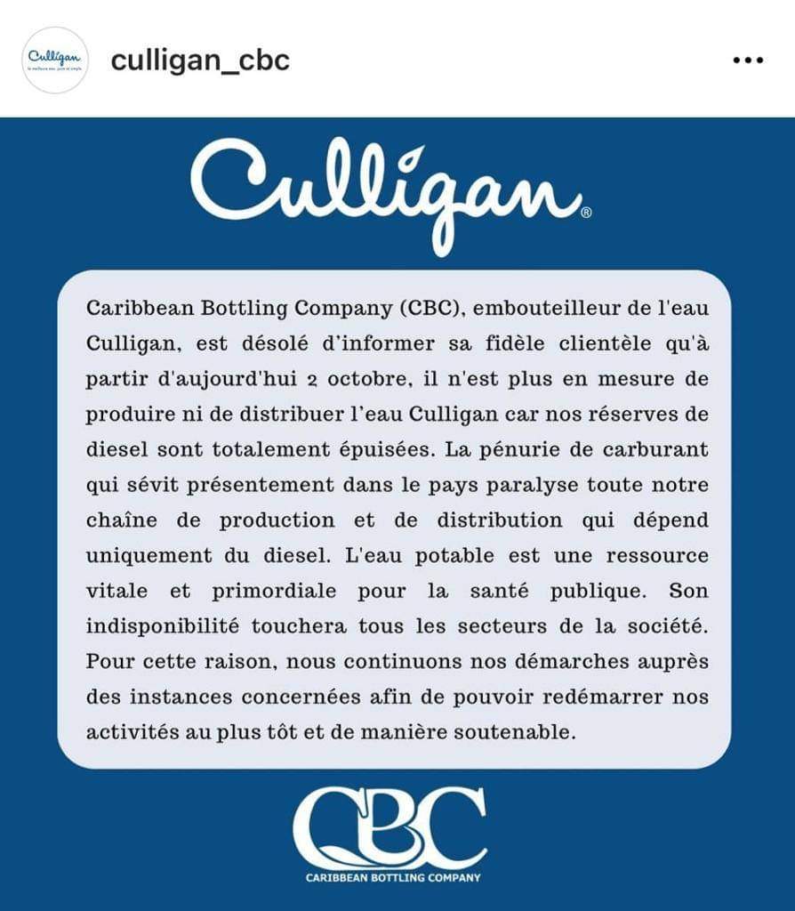 Alors que le Ministère de la Santé Publique et de la Population confirme les premiers cas de choléra dans la localité de savane pistache et plusieurs autres cas suspects à Cité Soleil, ” la “Culligan” informe à sa clientèle qu’ à partir de ce dimanche 2 octobre, il n’ est pas en mesure de produire et de distribuer l’eau à travers le pays. Ses réserves de Diesel sont totalement épuisées, peut- on lire dans un avis paru ce dimanche .