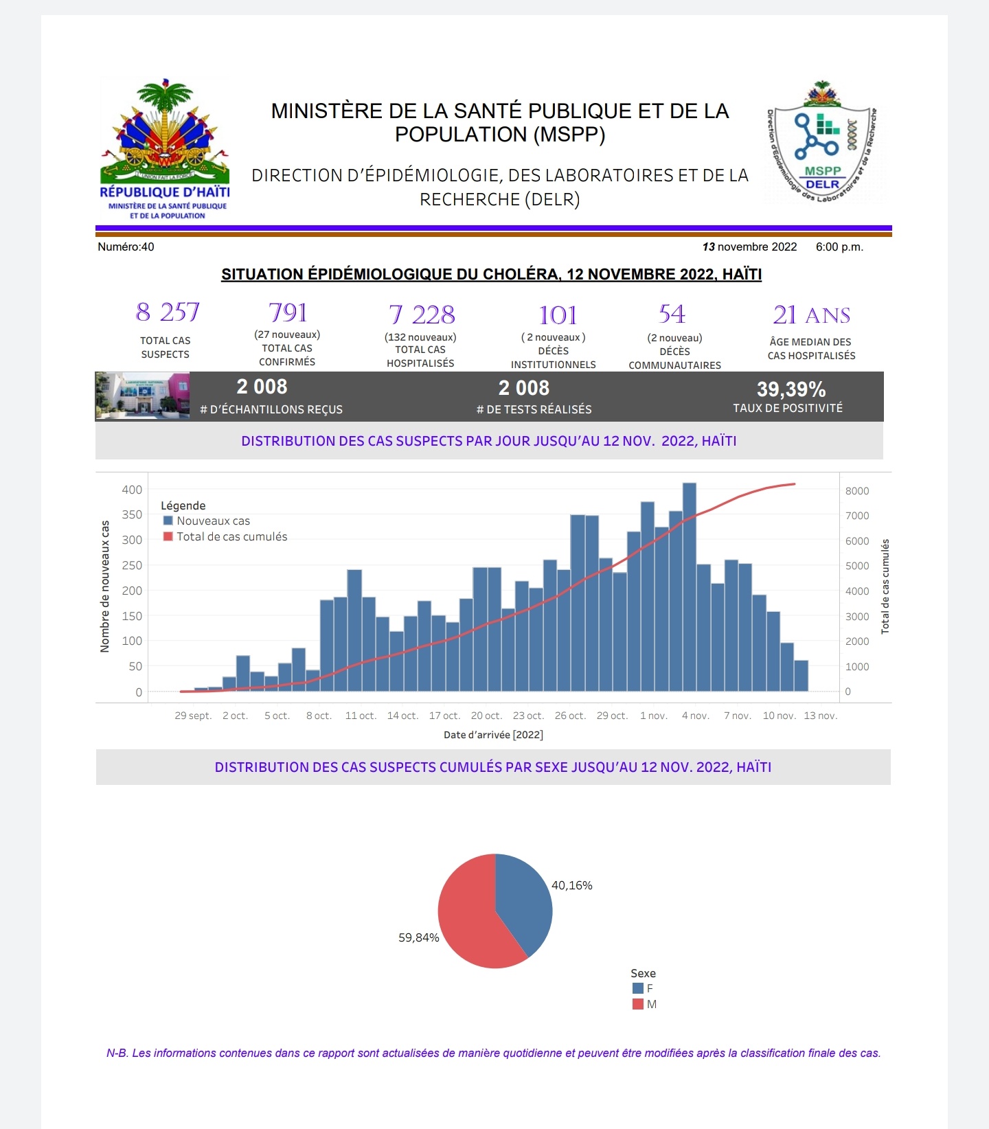 Le Ministère de la Santé Publique et de la Population (MSPP) a présenté l’évolution du choléra sur le territoire national pour la période du 12 novembre. Environ 8 227 cas suspects sont recensés, 7228 personnes sont hospitalisées.