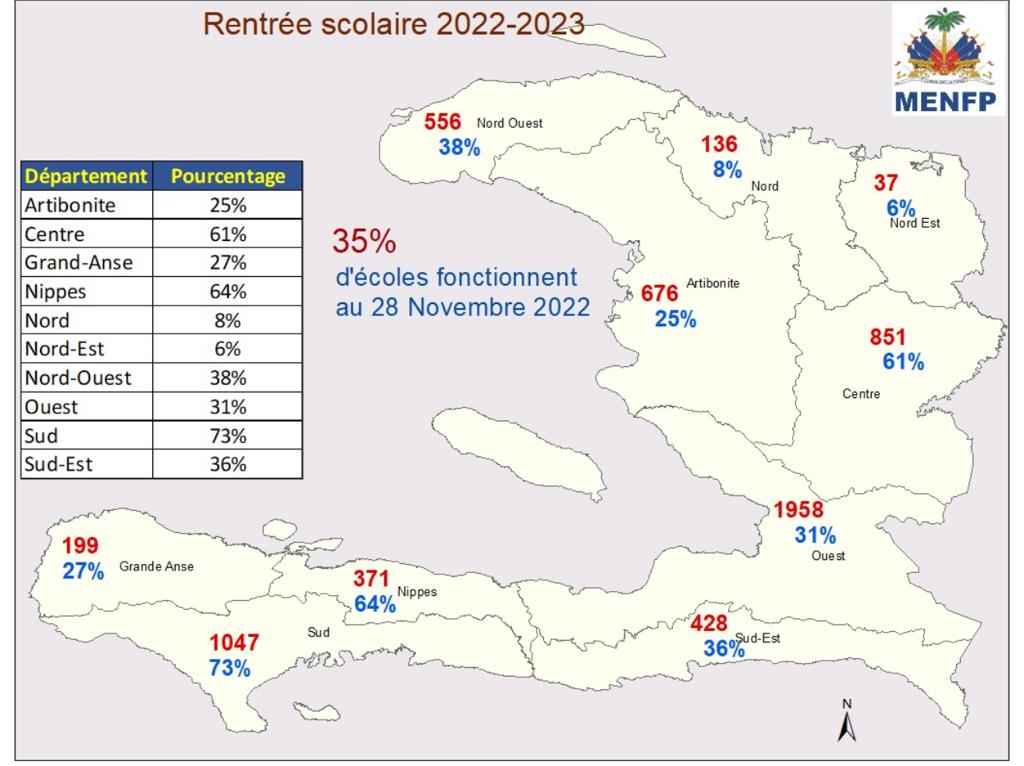 Le ministre de l’éducation nationale, Nesmy Manigat a indiqué que le pourcentage d’écoles qui fonctionnent dans le pays ce même lundi est de 34,33%. Selon le titulaire du MENFP, le nombre d’écoles qui fonctionnent continue d’augmenter partout dans le pays. La semaine dernière il était de 20,39%.