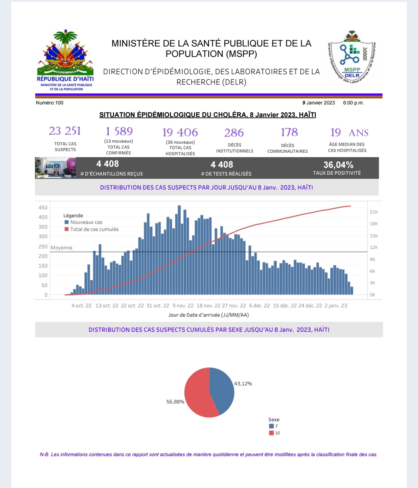 Le Ministère de la Santé Publique et de la Population à présenté l’ évolution du choléra sur le territoire national pour le 8 janvier 2023. Environ 23 251 cas suspects sont recensés, 19 406 personnes sont hospitalisées dont 36 nouveaux cas.