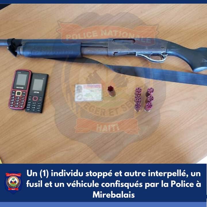 La police en collaboration avec le parquet de Mirbalais ont mené cette opération qui s’est déroulée non loin du cimetière de Marouge Contiguë et la commune de Boucan-Carré, au cours de laquelle la PNH a récupéré un fusil de calibre 12, de marque REMINGTON 870 POLICE MAGNUM, et de série C0 045087M, six (6) cartouches et deux (2) douilles, a indiqué la l’institution policière, précisant avoir également confisqué un véhicule de marque Rodeo, de couleur verte.