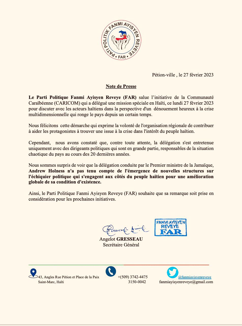 “La délégation de la CARICOM conduite par le Premier Ministre de la Jamaïque Andrew Holness n’a pas tenu compte de l’émergence de nouvelles structures sur l’échiquier politique qui s’engagent aux côtés du peuple haïtien pour une amélioration globale de sa condition”, écrit le Parti Fanmi Ayisyen Reveye (FAR) dans une note publique signée de son Secrétaire Général, Angelot Gresseau.