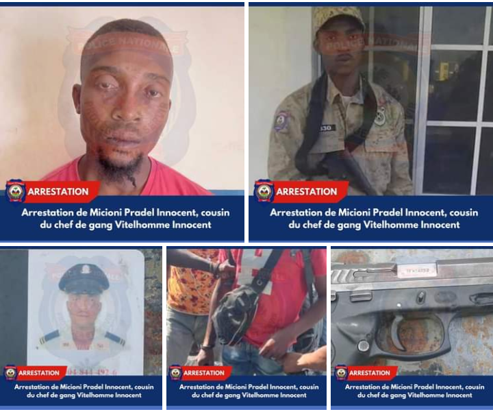 Le policier Micioni Pradel Innocent, cousin du chef de gang Vitel’Homme Innocent a été appréhendé vendredi 10 mars 2023 à Léogâne pour son affiliation au gang, a informé la police sur sa page Facebook.