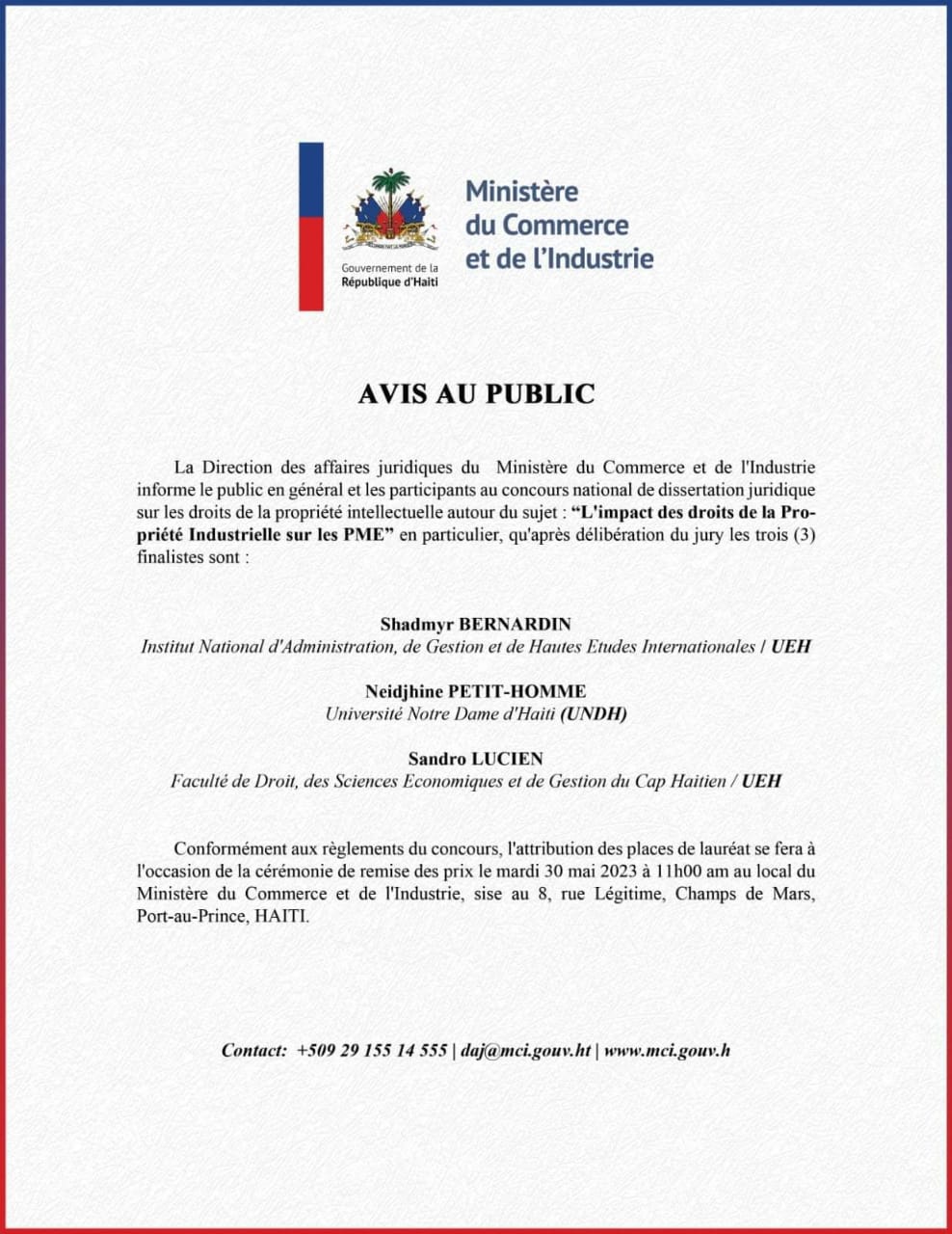 Le Ministère souligne que la remise des prix où l’attribution des places de lauréat se fera le mardi 30 mai 2023 à 11h A.M. au local du Ministère du Commerce et de l’ industrie sis à Champ de mars au numéro 33 à Port-au-Prince.