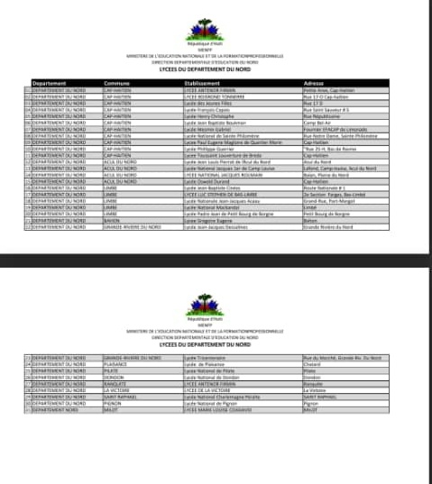 Face à cette situation, le MENFP annonce qu’il prendra des mesures strictes pour mettre fin à cette imposture. Ainsi, le ministère rend publique une liste des lycées de la République créés légalement par décision de l’État central. Cette liste, consultable sur le site officiel du MENFP (www.menfp.gouv.ht), vise à dissiper toute confusion et à empêcher que d’autres établissements illégaux ne se fassent passer pour des lycées.