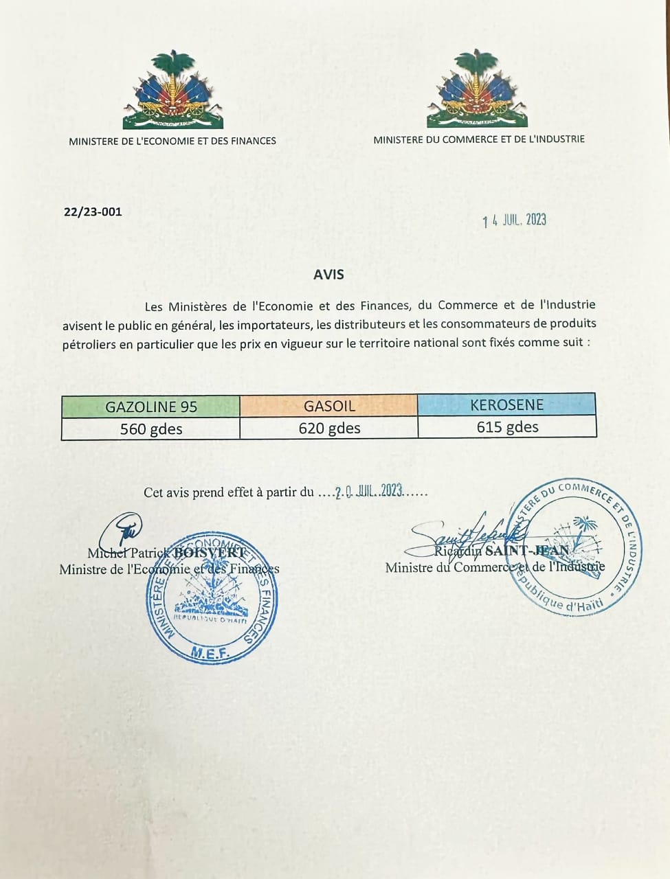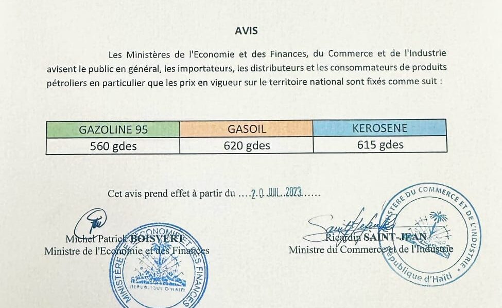 Dans un avis publié conjointement par le Ministère de l’Économie et des Finances (MEF) et le Ministère du Commerce et de l’ Industrie (MCI) le 14 juillet dernier, la Gazoline 95 est passée de 570 à 560 gourdes. Pour le Diesel (Gasoil), son prix est passé de 670 à 620 gourdes. Alors que le kérosène passera de 665 à 615 gourdes.