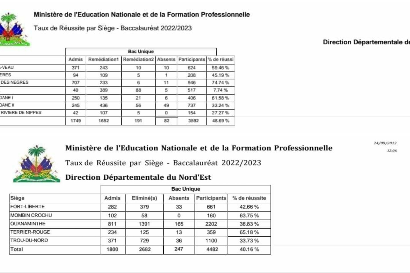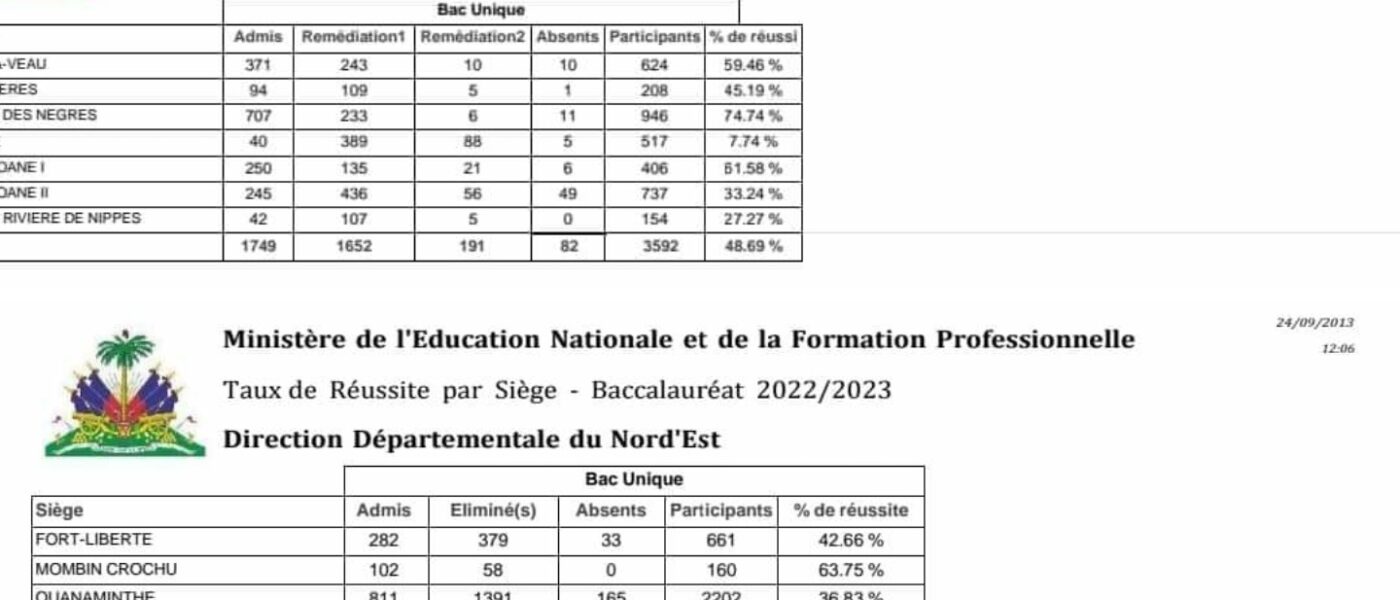 Le Ministère de l’Éducation Nationale et de la Formation Professionnelle a publié le mercredi 6 septembre 2023, les résultats des examens du baccalauréat unique (NS4) pour les départements des Nippes et du Nord-est.