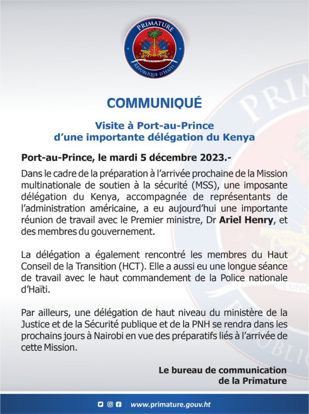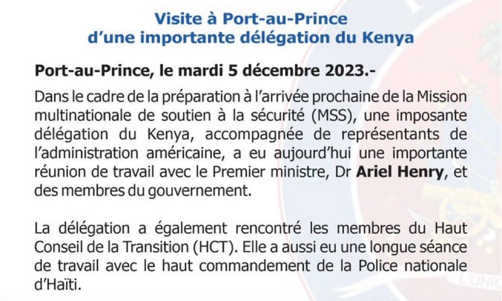 Une importante délégation kenyane qui séjourne en Haïti a rencontré le Premier ministre Ariel Henry ainsi que des membres du cabinet ministériel ce mardi 5 décembre autour des préparatifs du déploiement de la Force Multinationale de Sécurité et de Soutien à Haïti.