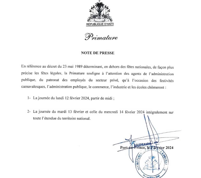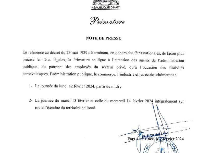 La Primature informe aux agents de l’administration publique, les employés du secteur privé que l’ Administration publique, le commerce, l’industrie et les écoles fermeront leurs portes le mardi 13 et le mercredi 14 février 2024 sur toute l’étendue du territoire national.