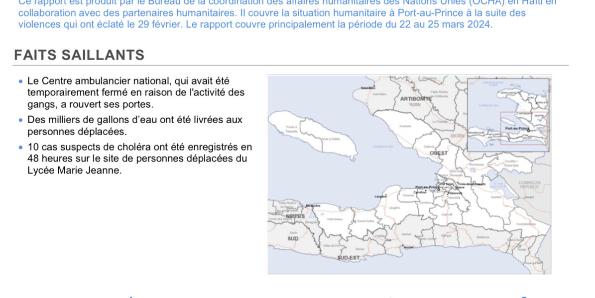 D’après le rapport de situation récent de l’Office de coordination des affaires humanitaires des Nations Unies en Haïti (OCHA), en partenariat avec des partenaires humanitaires, la situation humanitaire à Port-au-Prince demeure précaire après les violences qui ont eu lieu le 29 février.