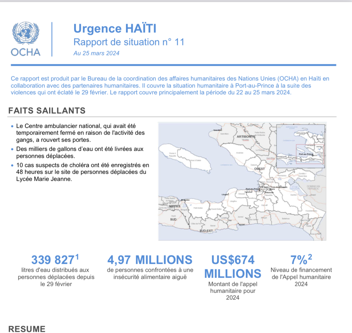 Le rapport souligne également d’autres données importantes, comme les 4,97 millions de personnes qui font face à une insécurité alimentaire extrême. De plus, le budget de l’appel humanitaire pour 2024 s’élève à 674 millions de dollars, mais le financement ne couvre que 7 %.