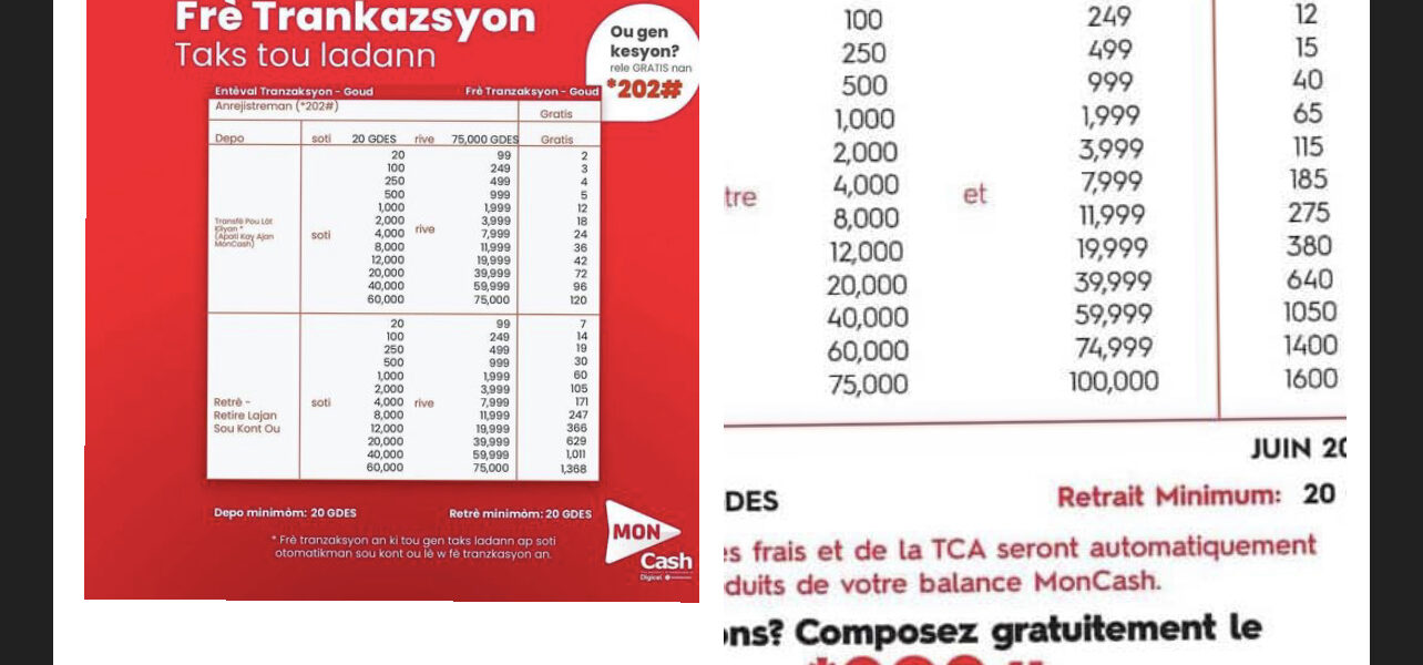 La surprise et l’indignation sont palpables. Les usagers du service Mon Cash doivent désormais débourser beaucoup plus pour effectuer leurs transactions. Par exemple, un retrait entre 75 000 et 100 000 gourdes nécessite maintenant 1 600 gourdes supplémentaires, une somme considérable pour de nombreux utilisateurs.