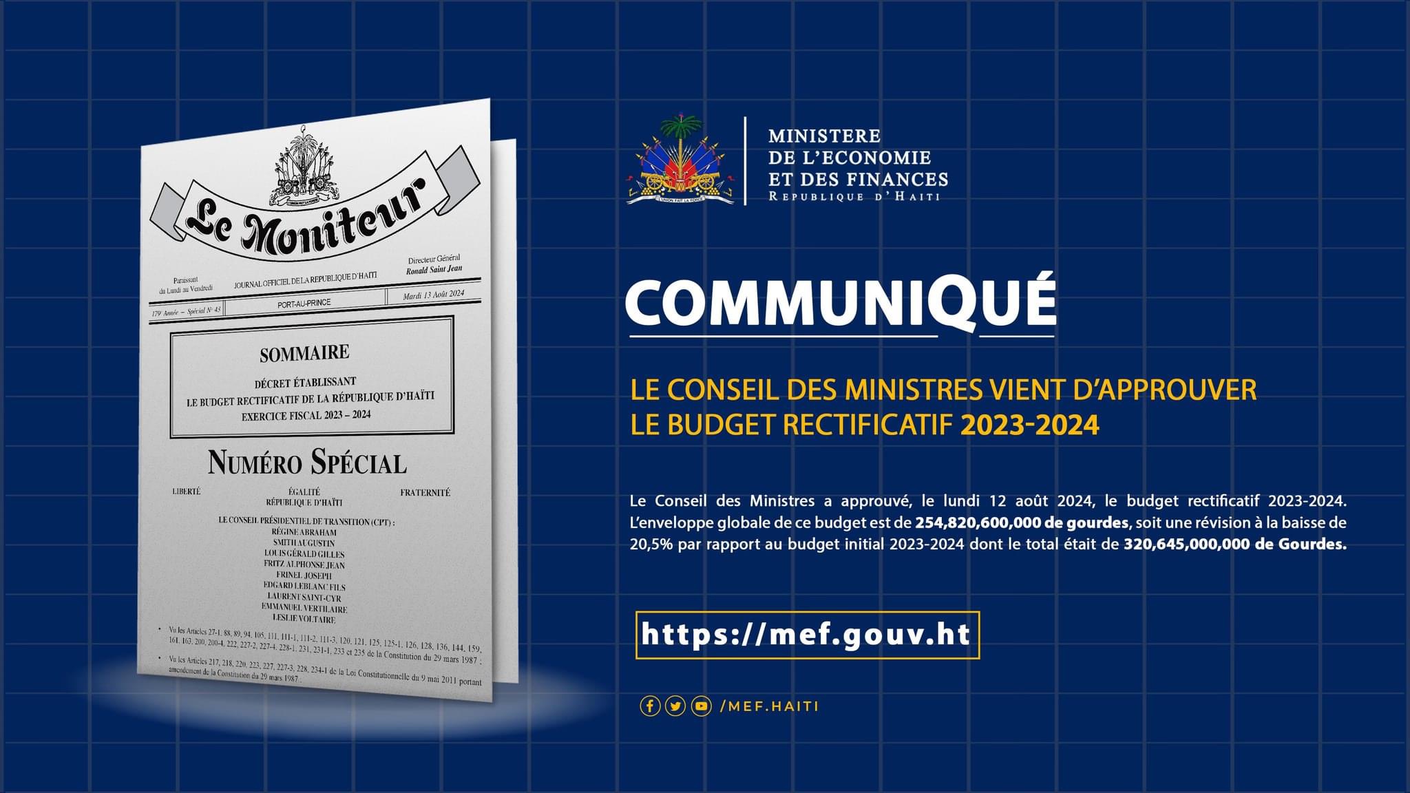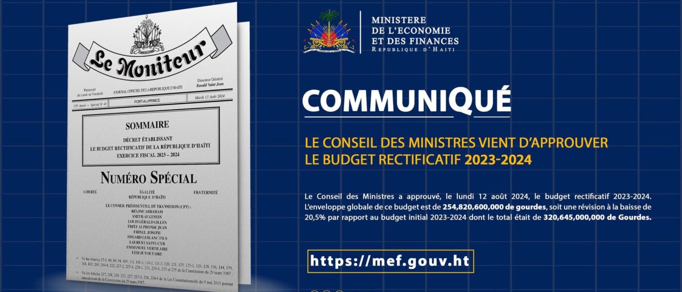Le gouvernement haïtien a officiellement publié le budget rectificatif pour l’exercice fiscal 2023-2024, révélant une révision significative par rapport aux prévisions initiales. Le nouveau budget, adopté en Conseil des Ministres et inscrit dans le Moniteur, s’élève à 254,82 milliards de Gourdes, marquant une réduction de 20,5 % par rapport aux 320,64 milliards de Gourdes prévus initialement. Cette révision reflète les défis économiques persistants du pays, rendant les objectifs budgétaires initiaux difficilement atteignables.