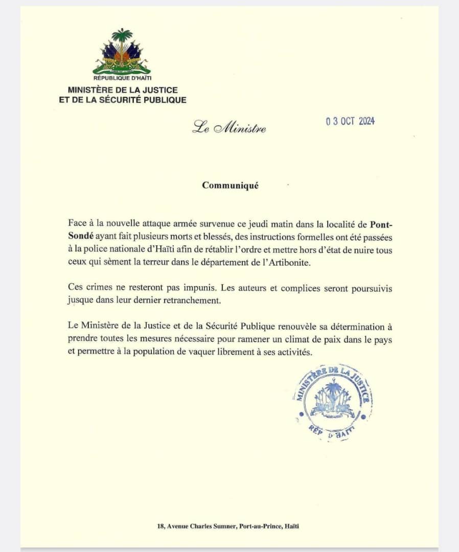 Le Ministre de la justice et de la sécurité publique, Me Carlos Hercule, a affirmé jeudi après-midi (03 octobre 2024) que des instructions ont été passées à la police nationale d’Haïti (PNH) pour rétablir l’ordre à Pont Sondé et mettre les bandits hors d’état de nuire, à la suite de l’attaque meurtrière perpétrée par le puissant groupe criminel « Gran grif » de Savien.