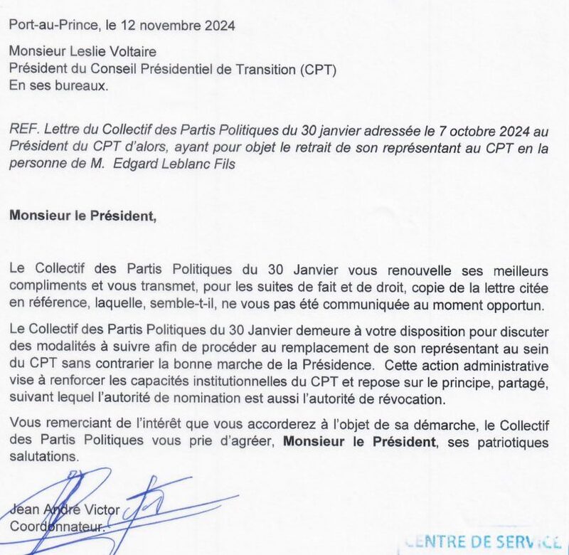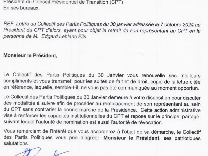 Le 12 novembre 2024, le Collectif des Partis Politiques du 30 Janvier a réitéré auprès du Président du Conseil Présidentiel de Transition (CPT), M. Leslie Voltaire, son intention de remplacer son représentant, Edgard Leblanc Fils. Ce remplacement s’inscrit dans une démarche visant à consolider les structures institutionnelles du CPT tout en respectant la stabilité de l’administration présidentielle, justifie le Collectif. Une copie de la correspondance envoyée le 7 octobre 2024, qui semble ne pas avoir été transmise à temps, a été annexée pour renforcer la demande.