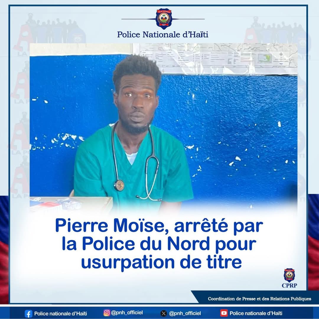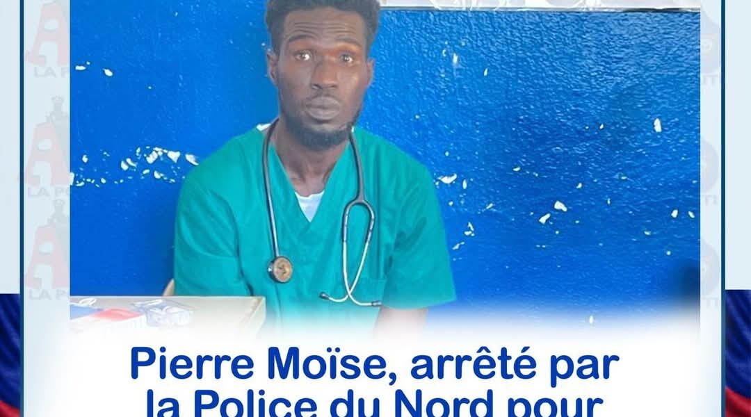 La police nationale d’ Haïti dit avoir procédé à l’arrestation de Pierre Moïse, le mercredi 15 janvier 2025, dans le département du Nord. Ce dernier se faisait passer pour un médecin officiant à l’hôpital universitaire justinien du Cap-Haitien, dans le département du Nord.
