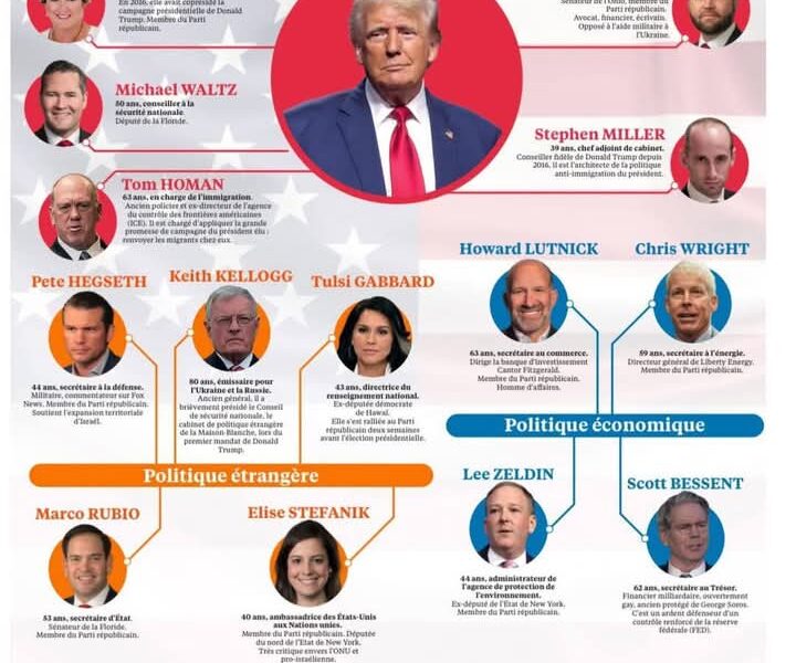L’administration de Donald Trump, comme illustré dans l’organigramme de l’édition de La Croix du 20 janvier 2025, se distingue par une organisation stratégiquement composée de personnalités influentes dans différents domaines. Ces individus, répartis en cercles proches, jouent un rôle central dans l’élaboration et la mise en œuvre des politiques présidentielles.