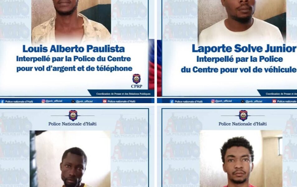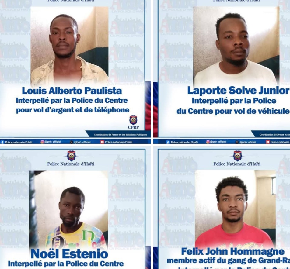 du Centre poursuivent la chasse aux bandits. Le nommé Noël Estenio a été appréhendé pour association de malfaiteurs et tentative d’ assassinat; Laporte Solve Junior pour vol de véhicule; Louis Alberto Paulista pour vol d’ argent et de téléphone; tandis Felix Jhon Hommagne est accusé d’être un membre actif du gang de Grand Ravine dirigé par Ti Lapli.