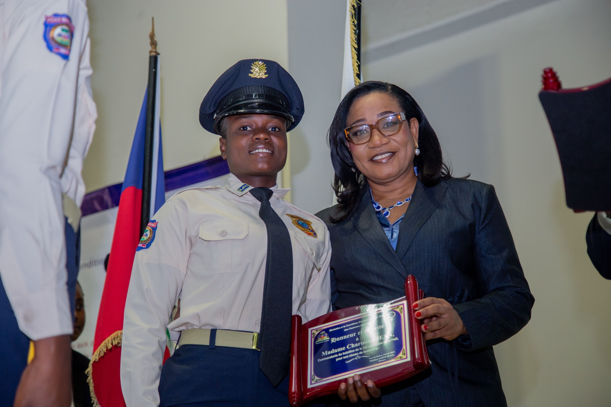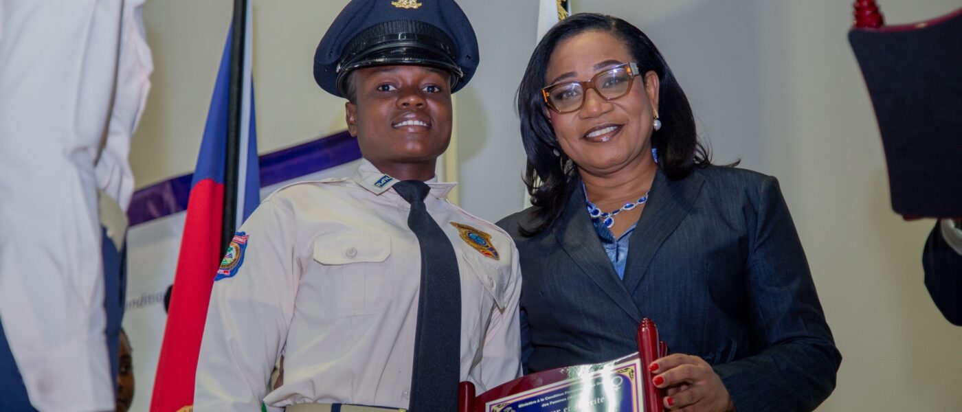 Parmi les figures mises à l’honneur, Arislodge Stifincia FRANÇOIS, deuxième lauréate de la promotion, a exprimé sa fierté et sa gratitude envers le MCFDF pour cette reconnaissance. Elle a rappelé le sacrifice et la détermination nécessaires pour parvenir à ce stade de leur carrière et a souligné l’importance de l’héritage des héroïnes de Vertières dans leur engagement. De son côté, l’Inspecteur général Smith PEYO, représentant du haut commandement de la Police Nationale d’Haïti (PNH), a salué cet accomplissement historique, précisant que jamais autant de femmes n’avaient intégré les rangs de la PNH en une seule promotion.