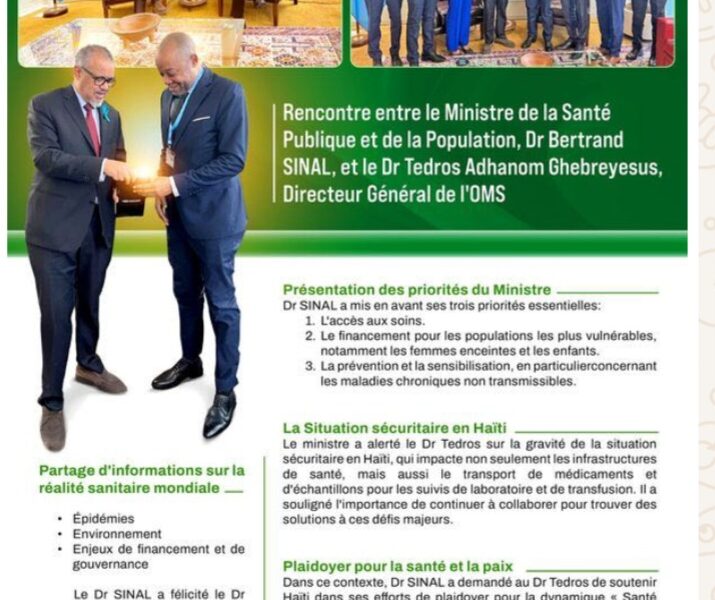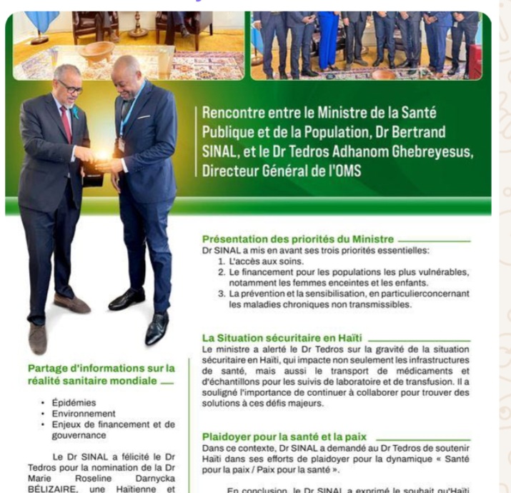 Dr Sinal encourage le Directeur Général de l’OMS à soutenir Haiti dans ses efforts de plaidoyer pour la dynamique Santé pour la Paix/ Paix pour la santé.