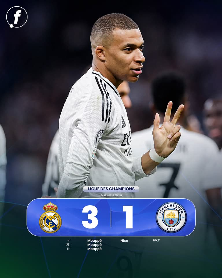 Le Santiago Bernabéu a vibré sous les exploits de Kylian Mbappé, auteur d’un triplé( 4′, 33′ et 61′) retentissant face à un Manchester City méconnaissable. Dès les premières minutes, le prodige français a imposé son rythme, déstabilisant la défense anglaise par sa vitesse et sa précision. Chaque action semblait prédestinée, chaque touche de balle rapprochant un peu plus le Real Madrid de la victoire. Les supporters, en liesse, ont assisté à une démonstration de football où l’art et la technique se sont mêlés pour offrir un spectacle inoubliable.