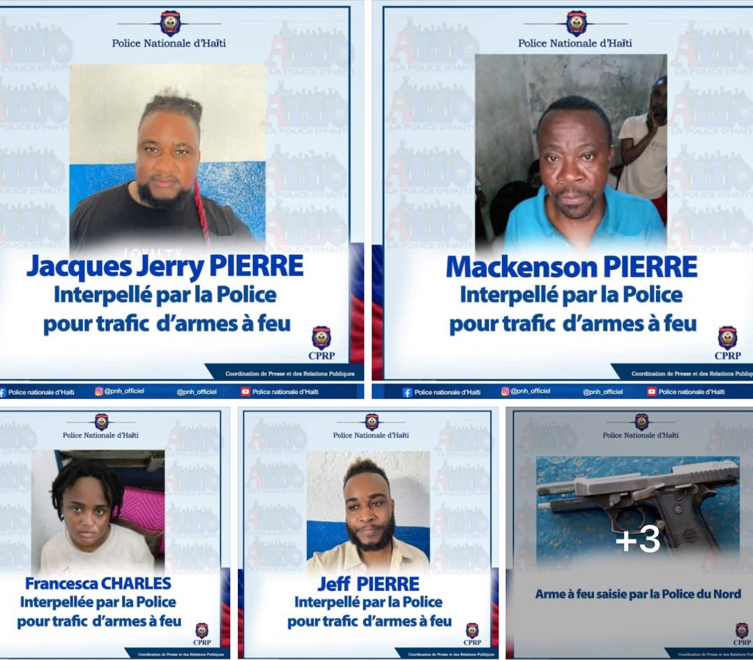 Le samedi 15 mars 2025, la Police Nationale d’Haïti (PNH) a effectué une importante opération dans le département du Nord, aboutissant à l’interpellation de quatre individus, dont deux frères, pour leur implication présumée dans un réseau de trafic d’armes à feu. Les personnes arrêtées, identifiées comme Jeff PIERRE, Jacques Jerry PIERRE, Mackenson PIERRE et Francesca CHARLES, ont été appréhendées suite à des informations reçues du Commissariat de la Commune de Saint-Raphaël. Ces alertes indiquaient que des suspects tentaient de fuir vers le Plateau Central à bord d’un véhicule Toyota, en possession d’une arme à feu.