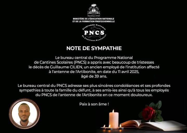 C’est avec une vive émotion et une profonde tristesse que le Programme National de Cantines Scolaires (PNCS) dit avoir appris le décès de *Guillaume Cilien*, ancien employé affecté à l’antenne de l’Artibonite. Il s’est éteint le 11 avril 2025, à l’âge de 39 ans.