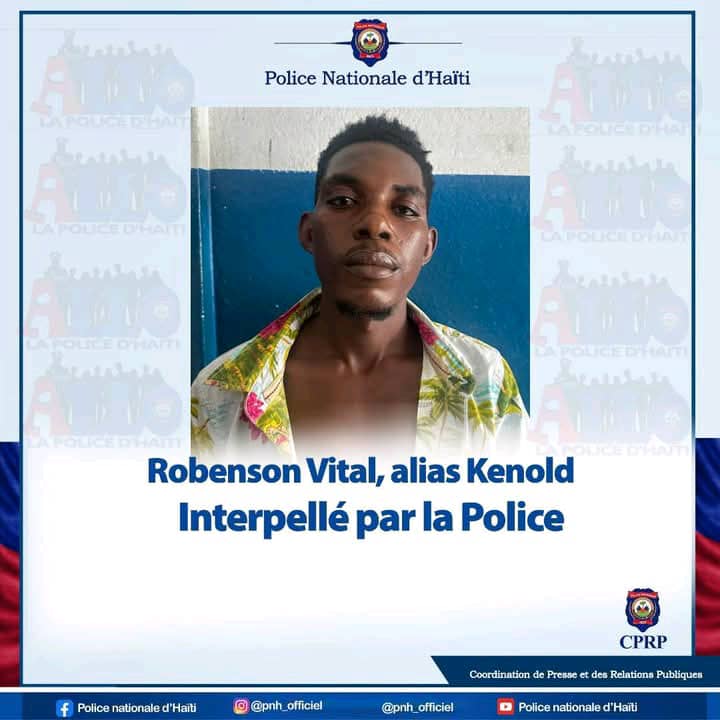 Port-Salut, 26 avril 2025 — Dans le cadre du renforcement de ses dispositifs de sécurité dans le département du Sud, la Police Nationale d’Haïti (PNH) a procédé à l’interpellation de Robenson Vital, connu sous le pseudonyme de “Kenold”. Cet individu est soupçonné d’appartenir au gang “Viv Ansanm”, tristement célèbre pour ses nombreux actes criminels à travers le pays.