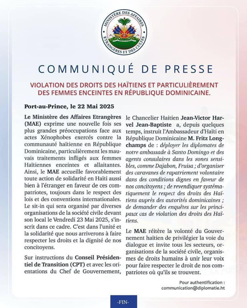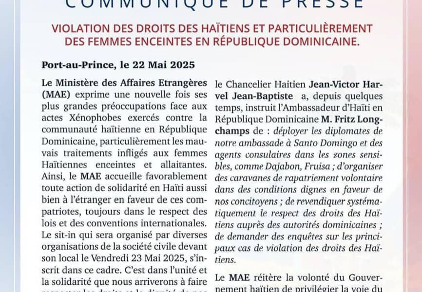 Dans un communiqué publié le 22 mai 2025, le Ministère des Affaires Étrangères d’Haïti condamne fermement les actes de xénophobie et les violations des droits humains infligés aux Haïtiens en République Dominicaine, particulièrement aux femmes enceintes. Le gouvernement haïtien appelle à la solidarité nationale et internationale, tout en annonçant une série de mesures diplomatiques pour protéger ses citoyens.